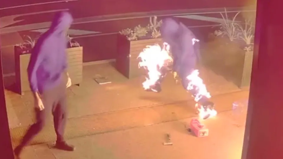 O suspeito de tentar incendiar um restaurante de fast-food em Melbourne, na Austrália, acabou colocando fogo às próprias calças, por engano. O momento foi captado por câmeras de videovigilância e divulgado pela polícia local nas redes sociais.