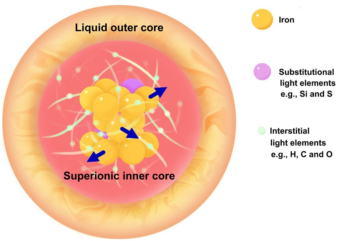 Os átomos de ferro formam uma estrutura hexagonal compacta rígida, com um subconjunto deles apresentando movimento coletivo. Dentro dessa rede de ferro, alguns elementos (intersticiais) difundem-se livremente, como em um líquido, enquanto outros (substitucionais) permanecem confinados como em um sólido. Consequentemente, o núcleo interno da Terra existe em um estado híbrido entre sólido e líquido.
