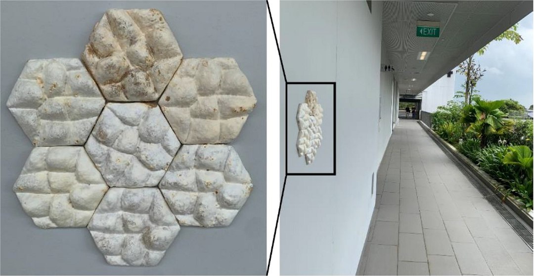 É uma biomimética dupla, com os ladrilhos inspirados na pele dos elefantes e fabricados usando um fungo natural da madeira.